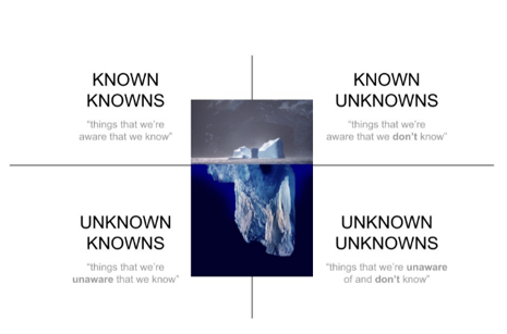 3. เรารู้ว่าเรารู้ (known knowns) ให้ความสำคัญกับความจริงเชิงประจักษ์ จับต้อง สัมผัส เข้าถึง และพิสูจน์ได้ ตามที่สัจนิยมมองว่า ความจริงมีหลายระดับที่ไม่สามารถรู้ได้ จนนำไปสู่การพยายามค้นหาความจริงที่ลึกจนมองไม่เห็นผ่านการพัฒนาเครื่องมือในการหาความรู้