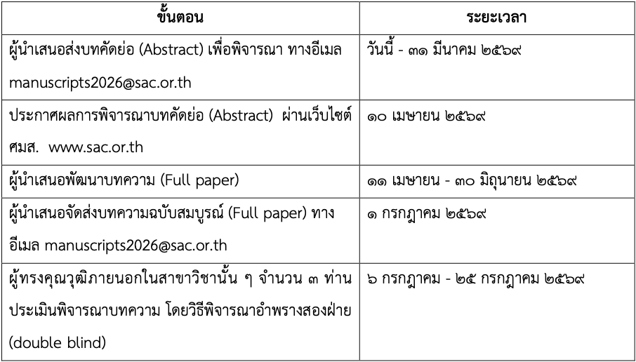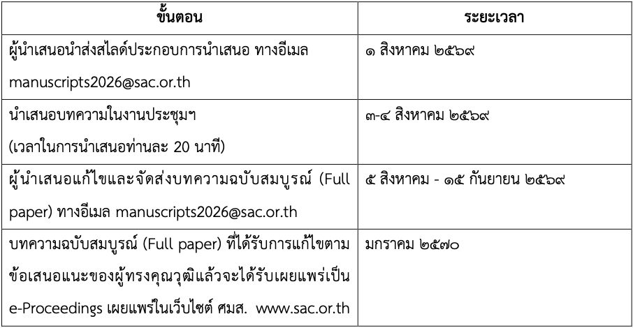 ๒. หากผู้นำเสนอบทความต้องการหนังสือแจ้งต้นสังกัด/หน่วยงาน ให้แจ้งความประสงค์และรายละเอียดมายังอีเมล manuscripts2026@sac.or.th